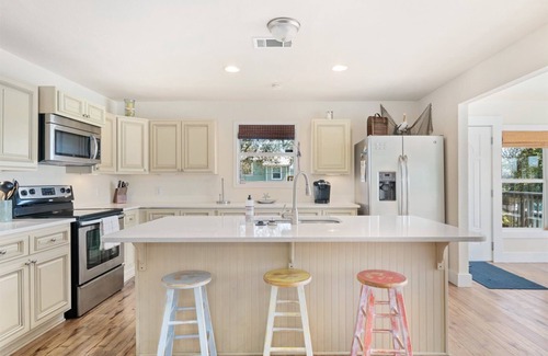 Inside, the upstairs level features a cheerful living area with a smart TV, a fully equipped kitchen with stainless steel appliances and an oversized island, and a dining space with lovely canal views. The sleeping arrangements include a king suite, a queen bedroom, a bunk room, and a downstairs private-entry suite with its own sitting area and walk-in shower—ideal for added privacy or multigenerational stays.