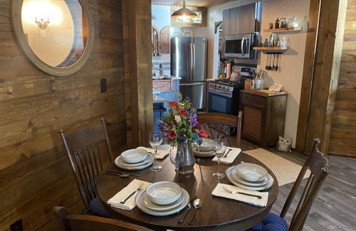 This unique vacation rental is geared for a fun, adventurous home base for families and friends looking to explore Fayetteville! When you aren't lounging at the shire - watching the birds, eagles, deer and other wildlife, head out to explore the Botanical Gardens of the Ozarks, the Crystal Bridges Museum, or catch a football game at the University of Arkansas's Razorback Stadium! Return home and watch the glorious sunsets while relaxing around the firepit, and fix a tasty BBQ on the outdoor grill, or use the fully equipped kitchen.