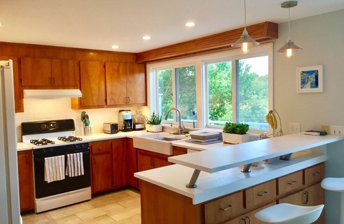 We love Woods Hole and think you will too! It has a truly unique ambiance and mix of tranquility, as well as accessibility. Once you park (or arrive via express bus from Boston), you will find everything you need within a short walk. These are approximate walking distances: Stony Beach (2 minutes); Woods Hole park and playground (3 minutes); center of town and Aquarium (5 minutes); and Martha's Vineyard ferry, the start of the Shining Sea Bikeway , the shuttle to Falmouth Center, and the bus stop (7 minutes). Stony Beach is famous for its gentle slope to the warm Buzzards Bay waters, which is perfect for children, and adults, alike. We provide both adult and children's kayaks and a paddle board which can easily be carried for use off of the beach (with adult supervision of children). Families, in particular, will enjoy the easy access to the park, including play structure, swings, beach volleyball, tennis courts, and baseball diamond. At the Aquarium, guests can check out the sea lions and some of the work of the local marine biologists. In town, there are wonderful restaurants, including Captain Kidd, the Landfall, and Pie in the Sky (whose made-from-scratch bread pudding is out of this world!). Those who like to bicycle will be especially happy at our home, not only given the beauty of Woods Hole and surrounding areas, but also because it is the start of the 10-mile-long Shining Sea Bikeway, which passes along the ocean, cranberry bogs and beautiful salt sea ponds and marshes. Day trips to Martha's Vineyard are easy from Woods Hole, whether on foot or on bike. The ferry leaves regularly and only costs approximately $7 each way. Our home was newly-renovated and includes 600 mbps high speed internet, and 2 large screen televisions with hundreds of free channels, including HBO, and an abundance of free on-demand offerings. The home is complemented throughout with original artwork from artists featured in the French gallery, Carre d'artistes. The furnishings are all brand new and feature a large sectional sofa and dining room chairs, all upholstered in supple leather. One only has to look out the window or off the deck to take in the wildlife present in and around Mill Pond, a location popular with bird watchers. Enjoying the view is made easy by the comfortable deck dining table and adjacent gas grille. We understand that plans sometimes change, and are, therefore, happy to grant net refunds, however, only to the extent that the house can be re-rented on the same net terms. Please reach out should you have any questions or concerns about this policy.