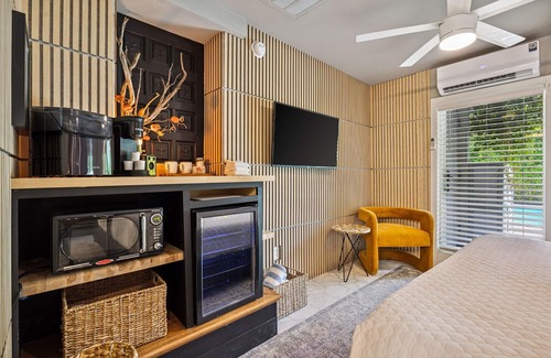 There’s no full kitchen, but you’ll find everything you need to chill… like a sleek mini fridge, microwave, ice maker, and coffee station.