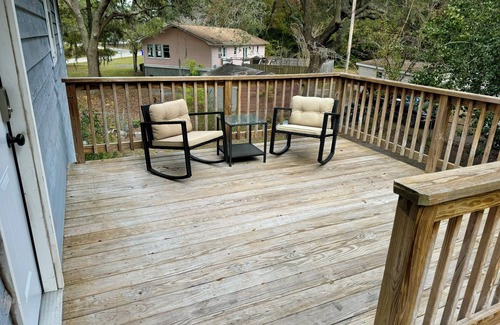 There is a large back balcony with a gas grill and 2 outdoor chairs. Surrounded by lots of trees including some beautiful grand live oaks, seems to make it our guests favorite place to hang out.