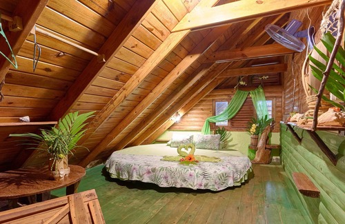Chalet 4 "Caribbean" is the largest villa of Chalet Tropical bio-hotel. It has a huge garden, and a big Jacuzzi-style stone pool with a waterfall, only for private use. It has two large covered terraces, one for relaxing and one for dining. Divided into 3 levels, it has on the 1st floor a large open kitchen, a large sofa-bed and a bedroom with a bathroom over it. The 2nd floor has two bedrooms with bathrooms: one triple and the other quadruple, with a mezzanine and another room up to it. The 4th bedroom is on the 3rd floor and has a bathroom.