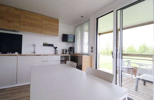 Nestled on a charming family campsite right on the picturesque Hegermeer, this modern terrace chalet offers a cozy and inviting retreat for your holiday. The covered, illuminated terrace provides the perfect setting for relaxing evenings outdoors, whether enjoying a meal or simply unwinding under the stars. The interior is bright and welcoming, with a clever layout that ensures both bedrooms open directly into a beautiful, modern bathroom. A special highlight is the playful area in one bedroom featuring a raised bed, making it especially fun and suitable for children, while a separate toilet adds convenience. Inside, the chalet is fully equipped for comfort and practicality. The kitchen has all the essentials needed for preparing meals, and the living room features a television for entertainment. Both the living space and bathroom are fitted with electric heating, ensuring a cozy atmosphere even on cooler days. The windows are equipped with mosquito nets and blackout roller blinds, allowing you to enjoy restful nights and fresh breezes without disturbance. The location offers direct access to the Hegermeer, where a lovely harbor has been created for water activities. Here, you can rent a sloop or sailboat on-site, or take a refreshing swim in the lake. A walk into the nearby village of Heeg is highly recommended, with its charming terraces on the water and boutique shops offering local delights. On the campsite, families can enjoy a recreation room with a football table and various games, as well as a playground for children, making this chalet the perfect base for an active and relaxing family holiday.