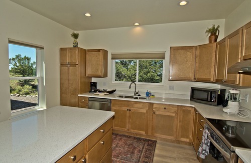 The suite is a great space for quiet retreats featuring alarge spacious kitchen stocked with dishware and bakeware for your extended stay. The kitchen features stainless steel appliances, a dishwasher, oven and range with large fridge and freezer. The dining area is elegant and has adequate seating if you have a larger group and rent the second upstairs unit that adjoins the suite througha locking door and stairway.