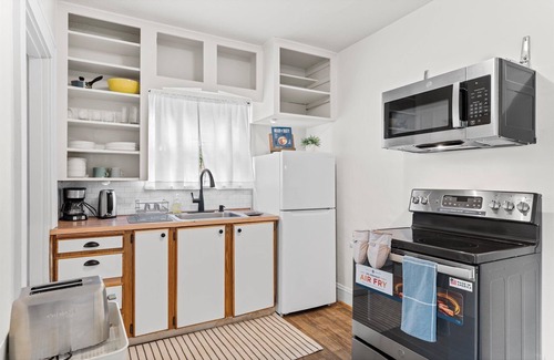 Beautifully rehabbed one bedroom space featuring original hardwood floors, fresh paint, new fixtures and appliances. Includes a dedicated work space, high speed WiFi. Get a good night's sleep on the full size bed with a hybrid gel infused memory foam mattress. Enjoy natural light in the inviting living room and whip up your favorite email in the fully stocked kitchen. Stream your fav shows on the smart TV, and never miss a delivery with the smart ring video doorbell. Additional garage space available for storage, please inquire. Were pet friendly with a shared fully fenced back yard and extra storage in the utility room.