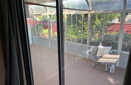The room features a comfortable queen-sized bed, a brand-new mattress, a walk-in closet, and a dedicated workspace with a desk. Shared with one other guest, the bathroom is well-maintained and stocked with essentials to ensure a pleasant stay. This room also has a private bath, private entrance, private carport and access to a large Sunroom