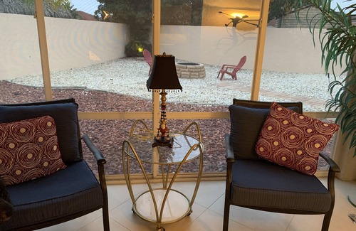 The master bedroom has a large bathroom and walk-in closet and a wall-mounted flat screen television. You can step outside from the master bedroom through your private entrance onto the enclosed lanai. The screened lanai is welcoming and is equipped with chairs and everything you need to relax. The lanai is also accessible from the living room through a separate set of French doors. The second bedroom has ample closet space and a full-size bed. The dining room, which is just off of the living room has a beautiful large dining room table. There is a sliding glass door off of the dining room that also opens to the patio area within the fenced backyard. The backyard offers privacy as it is fully enclosed within the fence. There is also a walkway to a new cozy built-in fire pit. This house is close to all amenities that the Villages has to offer. Our favorite thing to do is to walk to the Spanish Springs Town Square and participate in some of the many activities that The Villages provides.