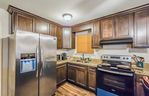 Located minutes from Main street, restaurants, shopping and entertainment. Enjoy your stay in a newly remolded, 3 bedroom/ 2 bath home in a safe, peaceful neighborhood. This home is fully furnished and has everything you need for a short or long stay.