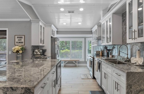 Inside, you’ll find luxurious marble bathrooms and a sleek, modern kitchen featuring a striking granite waterfall island with mitered edges, perfect for cooking and entertaining. The open-concept layout offers spacious living areas and beautiful views of nature, while still being close to great restaurants, shopping, and historic Downtown Sanford.