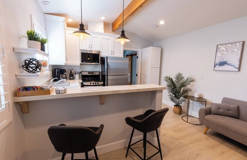 You'll have complete privacy during your stay. The ADU features a full-size kitchen stocked with coffee and tea for your enjoyment, as well as a bar to eat at and a small living area with a TV for relaxing after a day out.