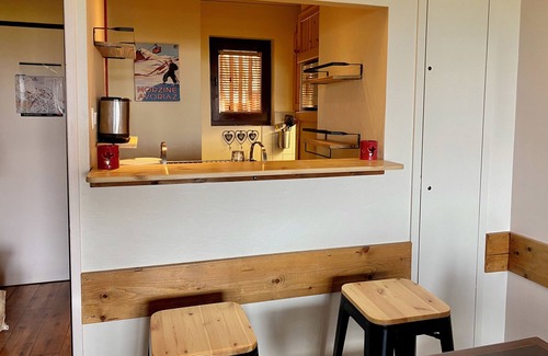 - A fully equipped kitchen and friendly thanks to the serving hatch open on the dining area