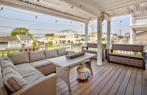 The living room opens up to a large front porch, overlooking spectacular sunset views of the Atlantic City skyline across the bay. Complete with a comfortable seating area, fire feature and mood lighting, this little slice of heaven is perfect for enjoying the refreshing sea breeze, lounging in the hot tub or gathering with friends and family. Wash down hose conveniently provided for rinsing off beach gear as well.