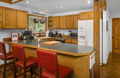 When you're not out exploring or enjoying your favorite outdoor recreation, indulge in some peace and quiet back at home. You can rest and recharge with a dip in the private hot tub or gather inside for shows and movies on the living room smart TV. There is a rustic firepit out in the yard for summertime s'mores and there's also a wood-burning stove in the living room for chilly-weather warmth. The cabin's full kitchen comes well-equipped for handling home meal planning. There's also a dishwasher equipped for easy cleanup. Additional perks include free WiFi and a private washer/dryer.