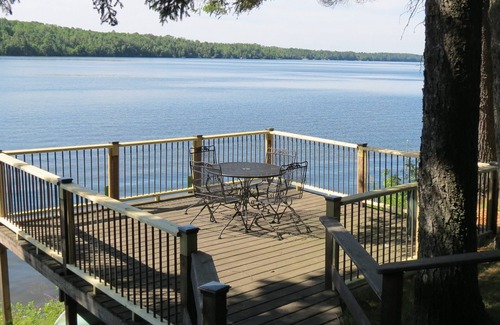 Our cabin is one of 5 cabins in a private association called Whispering Pines, that at one time, was a traditional "mom and pop" resort. The nearly 2 acres of grounds are well maintained and the property has over 180 feet of beautiful shoreline with a nice gravel-bottom swimming area. The grounds and shoreline are shared with the 4 other cabins, but this is the only cabin within the group that is available for rent, so it may be very quiet during your rental week. You enjoy all the amenities at Whispering Pines, including a fish-cleaning house with running water and a refrigerator for your bait. There's a basketball hoop for shooting baskets, horse shoe pits, a campfire ring overlooking the lake, a second campfire ring right next to the cabin, and a wonderful shoreline deck that's perfect for early morning coffee or for watching the kids swim. There is a large guest dock that you may use to moor your boat.