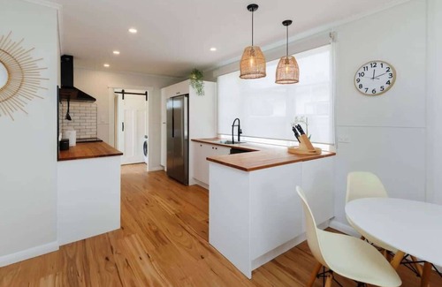 Inside, you’ll find a welcoming open-plan living area where the kitchen, dining, and lounge flow seamlessly together, perfect for relaxation. The cottage is equipped with WiFi for staying connected, and modern comforts like a smart TV ensure you're never short on entertainment. The space opens out to a large sunny deck through bifoldiong french doors, offering easy indoor-outdoor living for those laid-back afternoons in the coastal breeze.