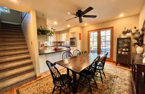Our fully furnished three bedroom, two bathroom home offers all the beauty and tranquility of a peaceful retreat. The living room is cozy with a fireplace and large screen TV. The open-design kitchen/dining room with bar area offers guests ample room to socialize. Granite countertops and stainless steel appliances. The patio features a covered porch swing with plenty of seating. Our backyard offers lots of privacy! While there is a hot tub shown in the photos, this is not offered as an amenity. The two bedrooms each have a queen size bed and share a bathroom recently renovated with glass tile. The living room furniture is all new and there is new carpet as well. We are a non-smoking home and no pets allowed.