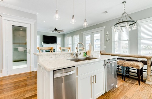 As guests step through the front door, they'll find the main bedroom of the home just to the right of the kitchen. This first bedroom features a private furnished balcony, a flatscreen TV, and a spacious en suite bathroom featuring double sinks, a standalone shower with a bench, and a jetted soaking tub. Head up the stairs and turn left to find the sunshine-filled second bedroom, which features a private entrance to the floor's balcony. Next door, the third bedroom (set up with a mellow nautical theme) features the second entrance to the second floor balcony. The nearby full bathroom in the hallway features double sinks and a standalone shower with a bench to serve the needs of these guests. At the end of the hall, the fourth and final bedroom of this home is a deluxe bunk room that features a flatscreen TV, a bonus sofabed, and an en suite bathroom featuring double sinks and a shower/tub combination. Every bedroom features a ceiling fan so guests can adjust the temperature to their own preferences.