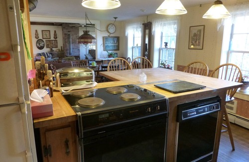 Old farmhouse located on 11 acres. Very private and excellent sledding hill in back yard. Charming and comfortable perfect for family fun. Nicely furnished, antiques, collectables, along with newer items. warm, baseboard heat along with a beautiful wood stove in living room. Great views and a beautiful sledding hill in back yard. 3 bedrooms and house will sleep 11 0r 12 very comfortably. Spa room and 6 person spa and a 4 person sauna. 3 baths. For large group there is also an apartment located below main house, apartment will sleep 5. There is a deck off main house and we do have a grill that can be used on the deck. No smoking allowed in the house. Only 15 minutes from ski areas and shopping areas. House trained dogs are allowed, house has dishwasher, washer and dryer. Everything is at house such as bedding, pots, etc. We have large scree television, and internet available. All linens provided.