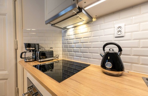 The stylishly designed sitting area, complemented by a foldable sofa, extends the apartment's capacity to host up to 4 guests comfortably. Whether you're relaxing in the cozy ambiance or preparing a delightful meal in the fully equipped kitchen, this apartment is your sanctuary in the heart of Prague.