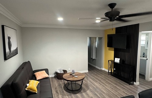 Welcome to this charming house in El Monte. This fabulous property features 2 bedrooms with a king bed and a full bed, along with a cozy living room with a futon for additional space. Guests can enjoy the excellent amenities such as AC and Wifi. The bathroom comes equipped with a bathtub for a relaxing soak. We're happy to assist with any questions while you stay at our house.