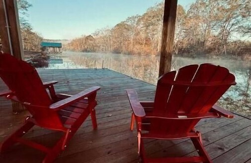 The 2-story, tin-roof cabin sleeps 14 and boasts 4 cozy bedrooms (a master on both levels!), 2 baths, a stocked kitchen, dining area. Enjoy the rocking chairs and hanging bed on the front porch. There’s also a swim pier, boat dock, fire pit, piano. Located 40 min from Birmingham. Bring your own boat (public boat launch five min away) or rent one nearby.