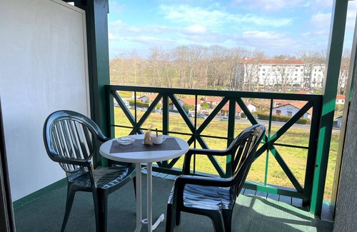 CAMBO, C103: on the 2nd floor of the residence "Le Patio", near the thermal baths and in the city center, studio "Lys" composed of a kitchen area (electric hob, fridge), dining area (table and 2 chairs) and a sleeping area with a 140 bed, bathroom with toilet, terrace and parking space.