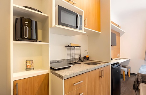 Estúdio estilo suíte com closet, cabideiro, geladeira e muitas outras comodidades. A região oferece uma grande variedade de lojas nas áreas externas, além de lavanderia self-service dentro do condomínio (a um custo acessível). É um excelente espaço para quem precisa trabalhar em casa.