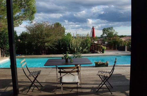 Villa located on the edge of a pretty little village with a beautiful view of the surrounding hills. In a quiet location. Recent villa 'sustainable' construction with a large living room overlooking the pool, 3 bedrooms on the 1st floor and possibility of a bedroom downstairs overlooking the garden. Any comfort: TV, WIFI, chain, electric barbecue, on request tennis table or 2 bikes. Walks on foot starting from the house. Shops at 1km200 in the village of Clarensac. Villa 13km from Nîmes, 45 km from Montpellier, 35 km from the sea. Not overlooked. private swimming pool.
