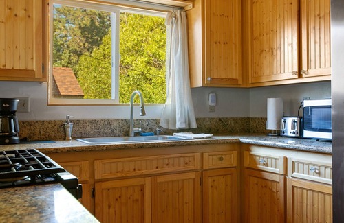 Our well-equipped large kitchen with stainless appliances and pine cabinets is a joy to cook in. Or grill a meal outdoors with fresh mountain air on our stainless steel propane grill. Eat at the log pine table and pine breakfast bar or outside on the picnic table under towering pines.