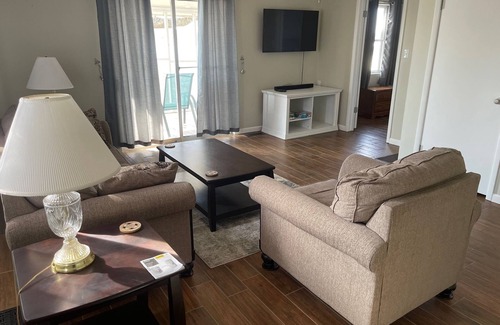 Kick back and relax in this calm, stylish space. King size bed and queen sleeper sofa comfortably sleep 4. Perfect for families, fishermen, bicyclists, hikers, and nature lovers. The boat launch is convenient walking distance from the Cottage. Boat parking is available on premises. View the natural beauty of the lake from the screened and covered deck, and watch the eagles, pelicans and wildlife that are present year round.