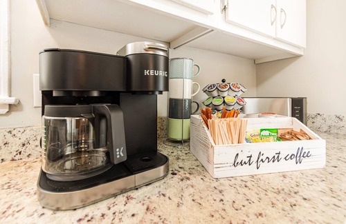 The common area includes a living area with a smart TV and seating, and there a quaint and peacful sunroom/sitting room off the back yard attached to the kitchen. The kitchen has granite countertops, stainless steel appliances with a Keurig coffee center.