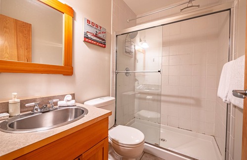 The in-suite laundry room has lots of room for storage and all that surf gear. The bathroom on the main floor is 3 piece with shower. The front deck provides direct access to a great lawn and off to the beach.