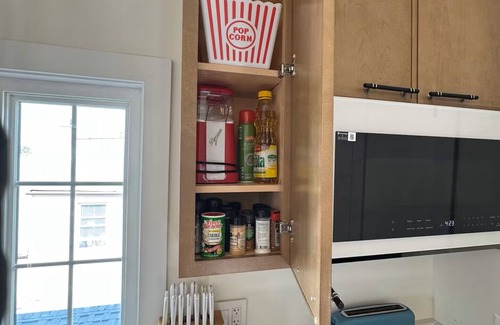 Lounge in the cozy living room with a 65" smart TV, or retreat to the bedroom for a movie night in bed with a 55" screen and a plush king-size bed that practically guarantees restful sleep. The fully stocked kitchen features sleek finishes, a spacious island with breakfast bar seating, and everything you need to cook—or just reheat your deep-dish pizza like a pro.
