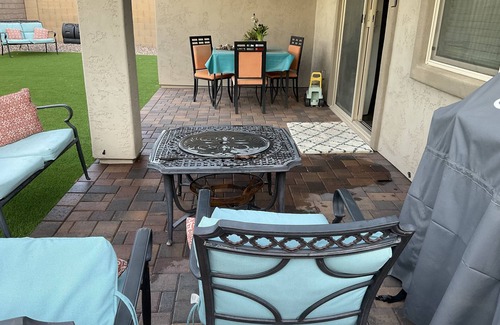 I rent my home Built in 2015, in a safe neighborhood, in Peoria, close to Cardinals Stadium, Sun City and Sun City West, with all conveniences ie. HBO, WiFi, washer/dryer, fenced backyard, 4 bdrms ; 3 queen size beds, 1 full size and baby/children’s room with crib. Packn play also available upon request. 20 minutes from Lake Pleasant Recreation area, Westgate/Cardinals Stadium, and Outlets. Fifteen minutes from Arrowhead mall, theatres and any restaurant you can think of.Walk to Parks with kids in warm sunshine most any day . My home is