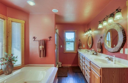 The master suite has a large tv and full bath with a jacuzzi bathtub and separate shower. The upstairs bedrooms share a bathroom with a shower/tub combo and the lower floor Bonus room has a 3/4 bathroom with shower and a large Smart TV perfect for watching movies.