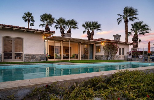 Come enjoy gorgeous views, history, charm, and Hollywood celebrity intrigue while staying at this magnificent gem in Palm Springs. An original John Porter Clark (1940) architectural home nestled in the foothills overlooking the city, this retreat is located in the exclusive and secluded `Little Tuscany Estates` neighborhood. Built for John and Fannie Hamrick, this historic masterpiece will transport you to the glamorous golden era of Palm Springs yesteryear. Make your way outside through the living area and you will be greeted by a sparkling private pool and sweeping views of the mountains beyond. Don`t worry about mealtimes, as a gas grill awaits for a cookout in the sunshine and a fully equipped kitchen awaits inside to whip up any recipe with ease. When it is time to head inside for the night, the wet bar will be ready for guests to make favorite cocktails and the spacious great room features a large sectional couch, vintage art, a 47` HDTV, and a large wood-burning fireplace to complete this inviting space.