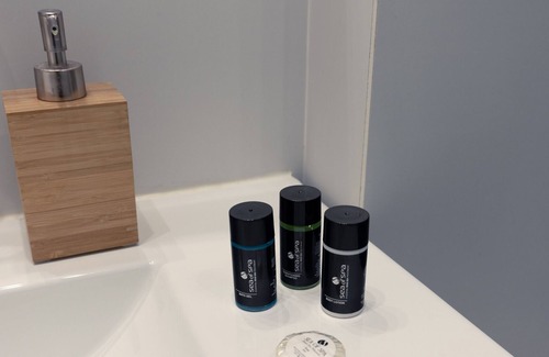 The bathroom boasts a refreshing shower, a sink with a large front mirror, a flushable toilet, as well as liquid soap and shower gel for your convenience.