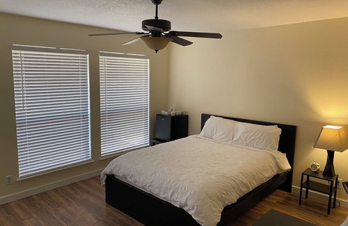 This room is the definition of private, own parking with covered metal awning, private entrance to a nice sized private yard, leading to the master bedroom with its own entrance. The room is sectioned off from the rest of the house with a double locked door and soundproof material. The room includes a full, freshly renovated shower and double sink, walk in closet, a small fridge and a microwave. AC and heater in the room also, along with a study desk and chair. TV has all of Direct TV plus streaming apps, location includes super internet Wi-Fi. Conveniently located in a small quiet neighborhood, walking distance from restaurants and bar, largest recreational park in San Antonio (McAllister park), etc…