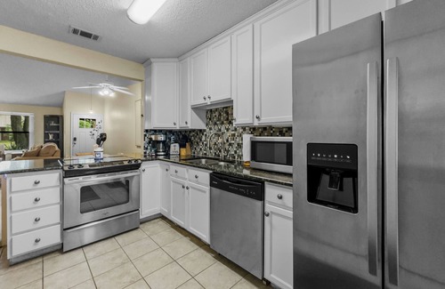 The fully stocked kitchen includes everything you need to prepare meals during your stay, plus a microwave, coffee maker, and all the essentials. A full-size washer and dryer are also available for added convenience.