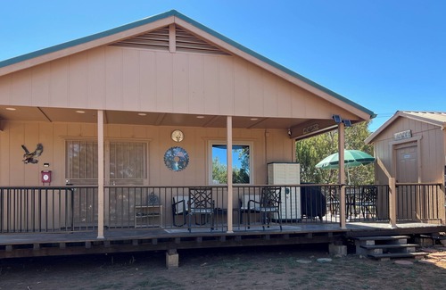 This cozy cabin is the ideal summer getaway. It sits on 1 acre of land and just minutes away from shopping, dining and recreation. It offers fully furnished kitchen, Wi-Fi, BBQ grill, horseshoe pit, outside seating areas with firepit, enclosed dog kennel and 2 car covered parking.
