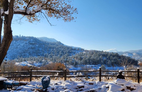 Located at the very mouth of the canyon that leads to Estes and Rocky Mountain National Park, 15 minutes from Boulder, your 1,350 sq. ft, 2 BR & Queen sleeping loft/2 Bath accommodations set at the top of 1/3 acre are a living expression of the local environment - passive solar, native sandstone floors, 16' vaulted cedar ceilings, alpine breezes, unparalleled St. Vrain Canyon, Continental Divide and Steamboat Mountain views from the master bedroom, open living area, large shaded back deck, clifftop patio, and fully fenced backyard.