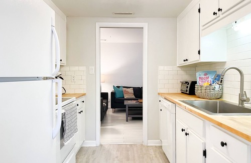 The dining room leads you into the spacious galley kitchen that has been newly updated with butcher block counter tops, subway tile backs splash and new appliances. The kitchen is fully stocked with enough dishes to serve 8 and also has plenty of pots, pans, bake ware, utensils, knives, cutting boards, mixing bowls, storage containers, microwave, coffee maker, Keurig, toaster oven, and more!