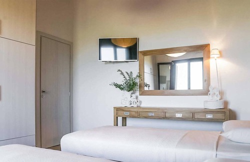 The stylish interiors are a delightful combination of modern décor and quirky motifs; whitewashed driftwood and a tree trunk coffee table are just a few examples of the owner's attention to detail. The main living, dining and kitchen open plan areas are on the ground floor. The first-floor bedrooms enjoy splendid sea views from the balcony. There is a communal balcony overlooking the olive groves for peaceful breakfasts and another space to spread out.