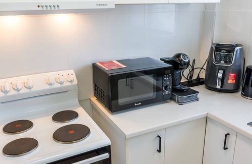 Step inside to a bright open-plan living area, where you can unwind on the comfortable lounge with your favourite show, or enjoy your morning brew from the Nescafé Dolce Gusto coffee machine. The split-system air conditioning ensures year-round comfort, and free Wi-Fi keeps you connected during your stay.