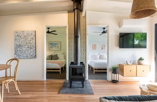 Private and cosy, this bright beach home is in the heart of the Peninsula. With wooden floorboards spilling out on to a spacious deck, a well-appointed kitchen, working fire place and two comfortable bedrooms it has everything you need for a dreamy escape.