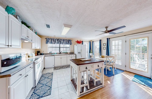 Enjoy relaxing in your own heated spa, or play some games in an open-air lounge area! This comfortable cottage boasts all the goodness of a beach house, in a wonderful location for enjoying everything St. George Island has to offer. Enjoy the sounds and smells of the ocean from various parts of the home. Central air conditioning keeps the interior cool, and you can fire up the pellet fireplace once the sun goes down. The open kitchen features full-size appliances and a prep island that doubles as a dining table with stools. Of course, there's always the option to dine outside. Additional amenities include a washer/dryer to take care of all your swimsuits. Enjoy watching the sun goes down from your own furnished balcony. You're never far from the ocean at this sun-filled cottage.