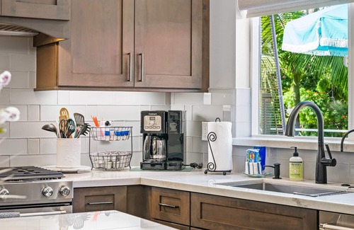 The Hideaway Junior features a thoughtfully designed space, including one bedroom and a full bathroom on the main floor. The open concept kitchen and living room area provide a modern and comfortable atmosphere. The gourmet kitchen boasts full-size stainless steel appliances, including a fridge, stove, dishwasher, and microwave. A beautiful quartz island adds a touch of elegance, making this the perfect haven for couples or small families. For added convenience, a full-size washer and dryer are provided. Both the living room and bedroom are equipped with Smart Roku TVs for your entertainment needs, including access to Hulu, Disney+, and ESPN. Ductless mini splits in the kitchen, living room, and bedroom ensure optimal temperature control. The Hideaway Junior shares a lush landscaped property with the attached Casa de Kona - Casita (Vrbo # 2084422), which can be rented separately or together as the larger Casa de Kona - Villa (Vrbo # 2084425). However, the Hideaway Junior retains its own private spaces. When you rent the Hideaway Junior, you will have a designated private entrance, a personal outdoor dining table on a private deck with a lounging area, a BBQ grill, a fire table, and a patio heater. The only shared space is the expansive grassy yard that extends beyond your deck. The maximum capacity for vehicles is 2, and street parking is available directly in front of the home.