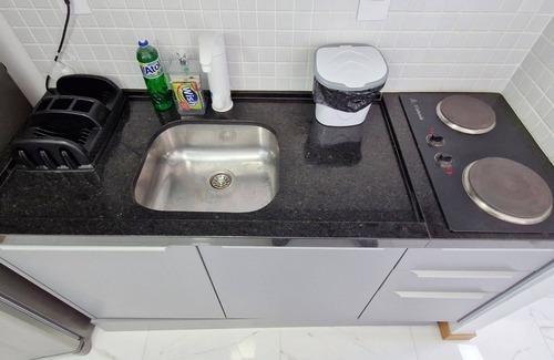 - Complete kitchen with duplex refrigerator, electric cooktop with 2 burners, water filter, countertop with two stools, electric coffee maker, microwave, sandwich maker, blender and basic kitchen items.