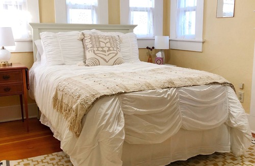 The downstairs bedrooms are quaint and equally charming, both with queen beds. One bedroom connects to a spacious bathroom, which also connects to the kitchen.
