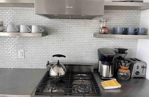 Fully stocked kitchen with all the kitchen amenities you will need. Refrigerator with freezer, stainless steel oven, plates, bowls, cups, silverware, pantry, knives and so much more. You’ll just need to bring groceries. Although the kitchen is completely renovated the stove top is quite quirky and will take some getting used to. Hold the first burner to act as “ignitor” to light the rest. Quirky but works great once you get used to it.